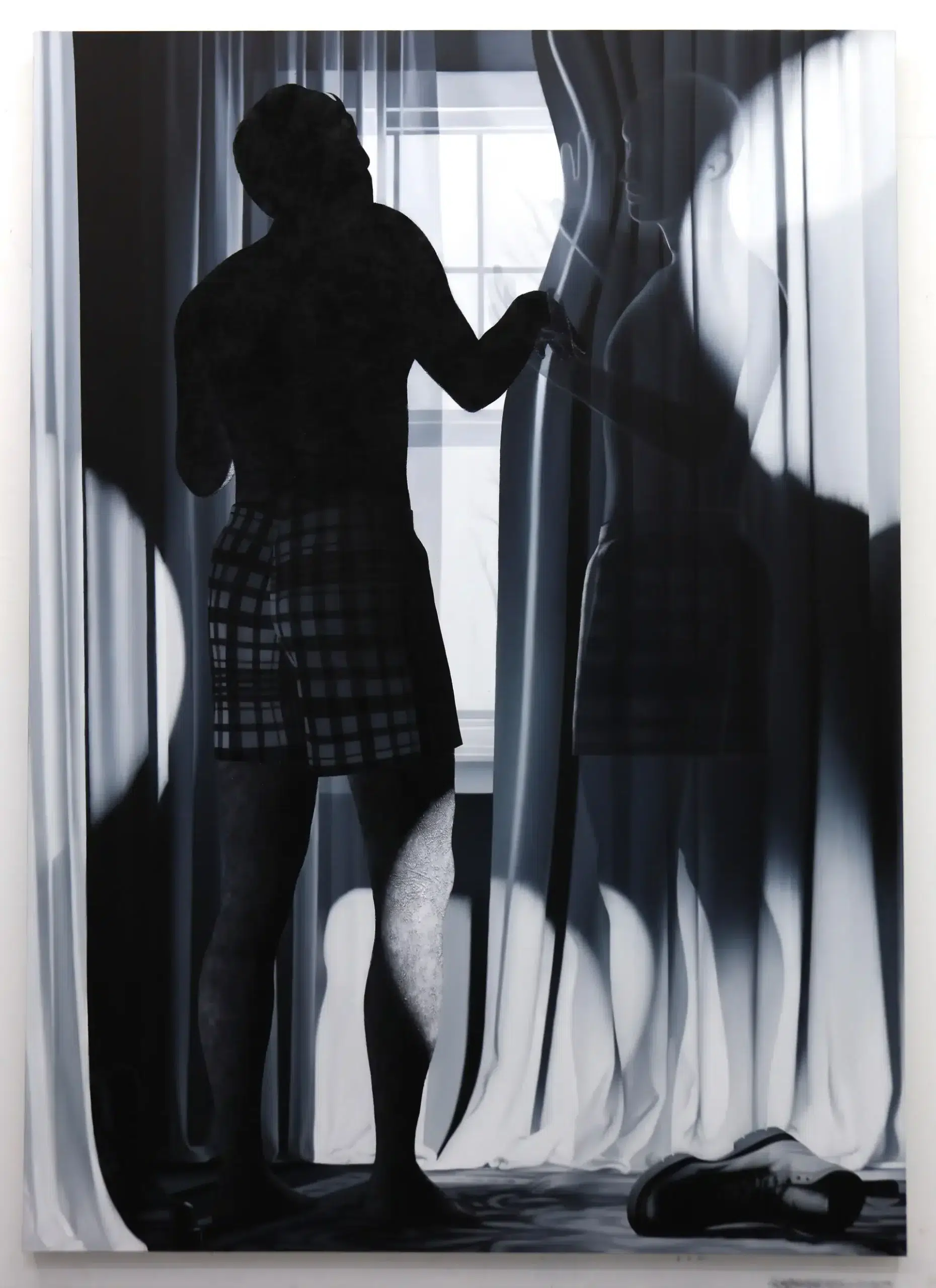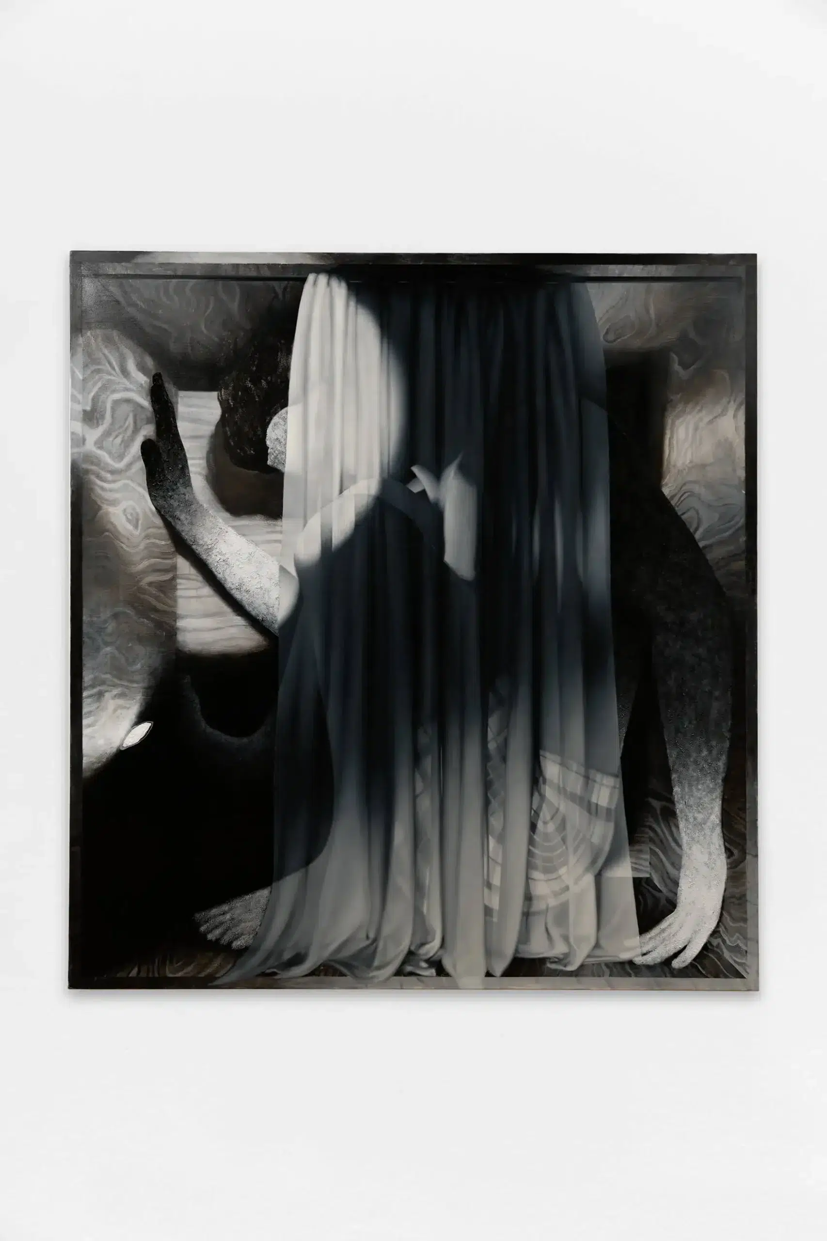 Dustin Emory's work delves into themes of confinement, isolation, and human resilience through a monochromatic lens. Employing unconventional angles and surrealist lighting, he uses oil, acrylic, and pumice stone on large canvases to create emotionally charged, textured compositions.