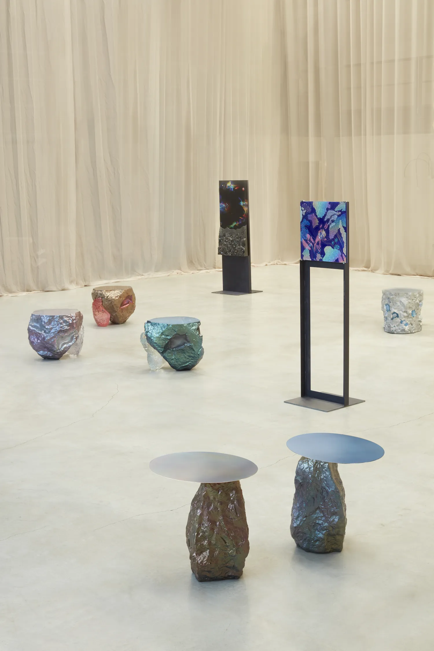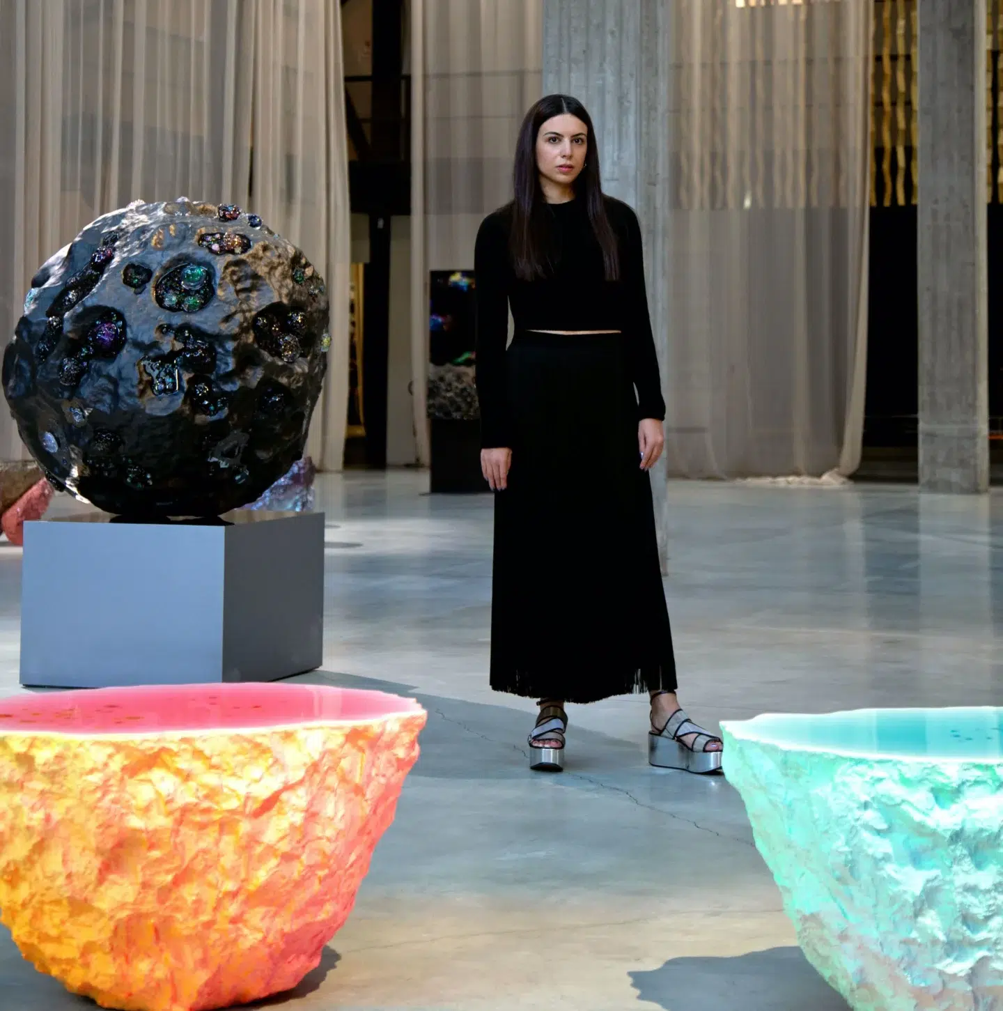 In Audi's work, glass plays a pivotal role as she explores a speculative, utopian future in which humans create cosmic fragments and novel landscape formations. By harnessing the unique properties of glass, Audi underscores the duality between the real and virtual worlds.