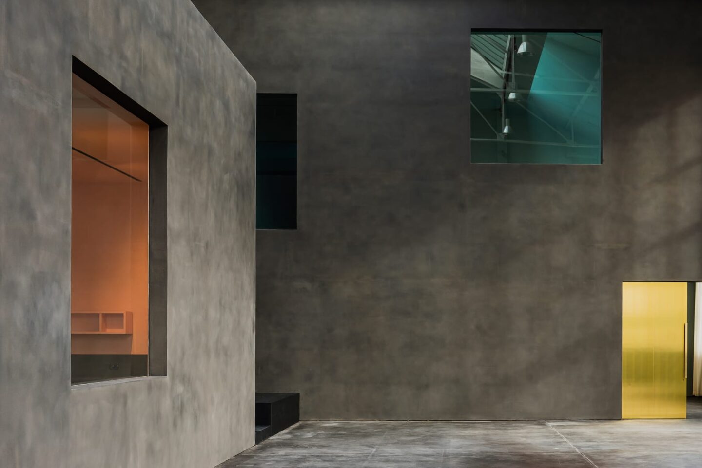 Voigt tells Williams that in the design of the studio, colour was also of key importance. Black was used consistently for the floors and walls, while windows varied from different tones of blue and green. As the waters of the Spree River move, colours reflect through the windows onto the walls, and the studio becomes a relaxing and inspiring environment for the creation of Voigt’s celebrated conceptual drawings and collages, resembling sound waves and scientific diagrams.