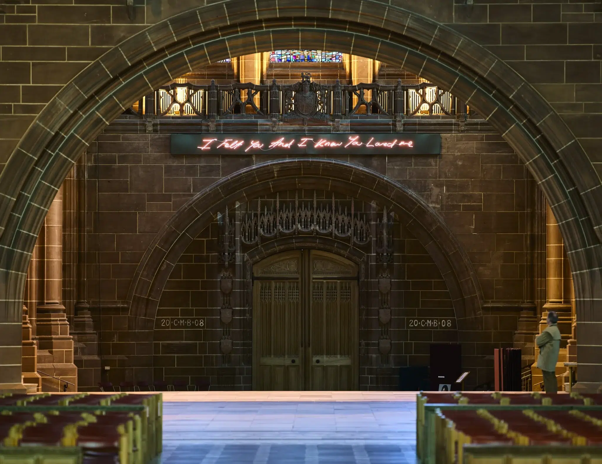 Emin frequently situates her neon works within public and architectural settings, extending personal declaration into communal space. A significant example is For You (2008), installed in the West Window of Liverpool Cathedral. The work reads, “I Felt You And I Knew You Loved Me,” its glowing script suspended within the vast Gothic architecture of the Church of England’s cathedral. The placement is striking. Neon, a medium associated with urban nightlife and commercial signage, inhabits sacred space.