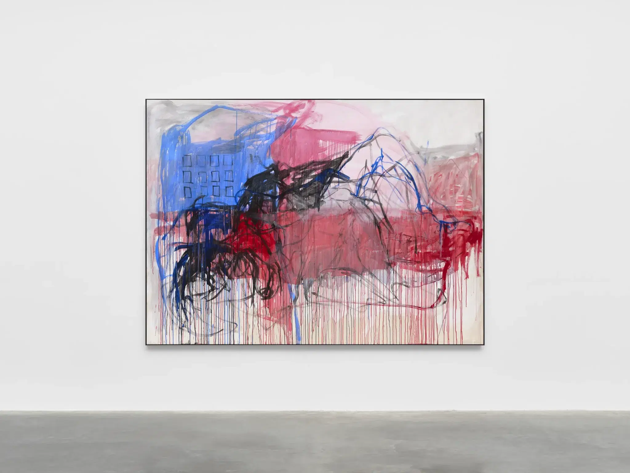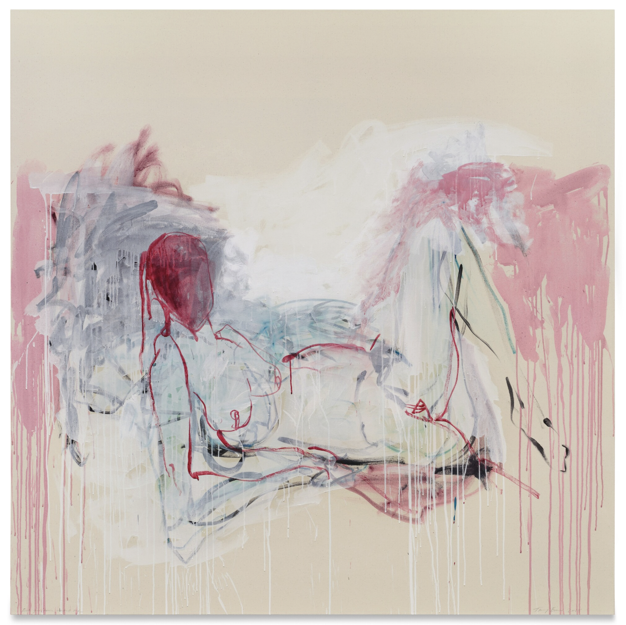 The composition feels more abstract than many of her earlier figurative canvases. While the female body remains central, it is partially entangled within a dynamic field of colour and line. A reclining form stretches across the surface, yet its contours dissolve into gestural sweeps of red, black and blue. The figure appears exposed, almost suspended within an indeterminate space, and space dissolves into fields of saturated pigment. In this work, Emin pushes the balance between figuration and abstraction further than in many of her earlier paintings. In the back left of the composition, she also introduces what appears to be a building, suggested through geometric forms. This structure may allude to the idea that, as human beings, we inhabit only one body, one place of shelter to care for and endure within; even through illness, there is no possibility of finding a new “home.” Exhibited as part of I Followed You to the End at White Cube Bermondsey in 2024, the painting signalled a new phase in Emin’s practice. The exhibition was widely understood as marking her reemergence following illness.