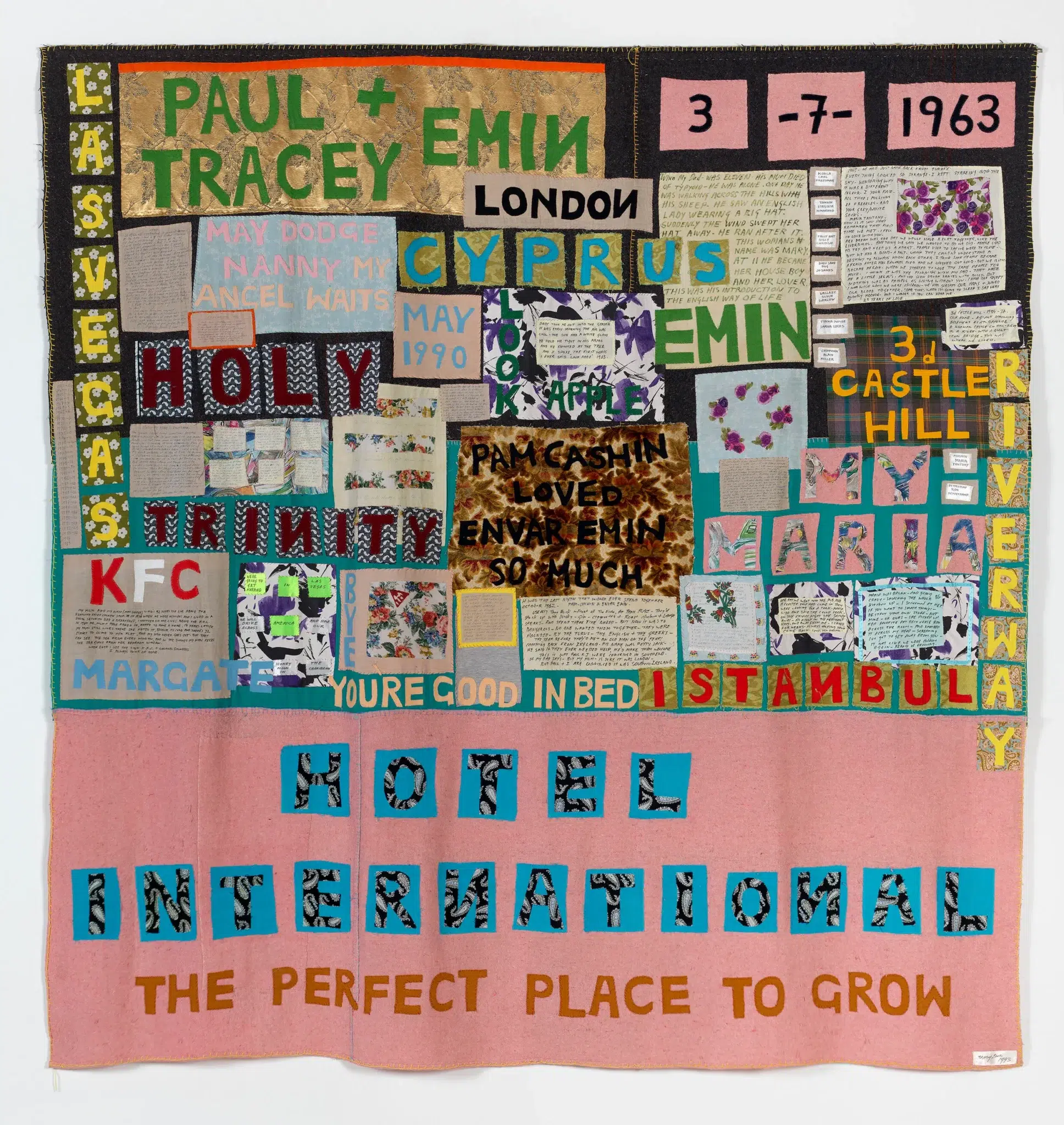 The quilt takes its title from the hotel Emin’s mother ran in Margate during her childhood. Her early life was difficult, and she experienced sexual assault, an experience she later reflected on in her memoir Exploration of the Soul. The work does not recount these events directly; rather, it weaves them into fabric, text, and fragments. Names of family members are stitched across the surface, while smaller panels recall episodes from her early life.