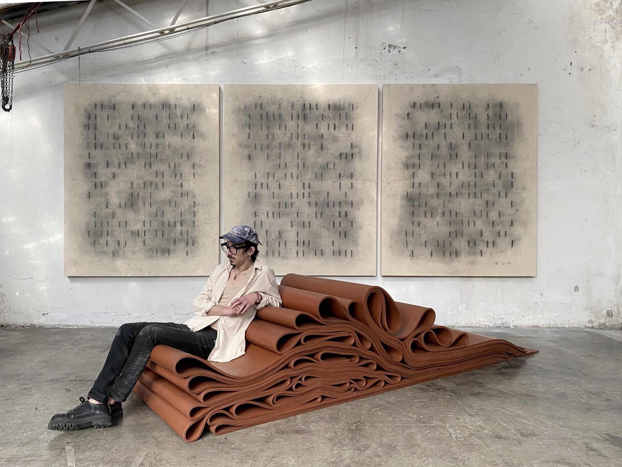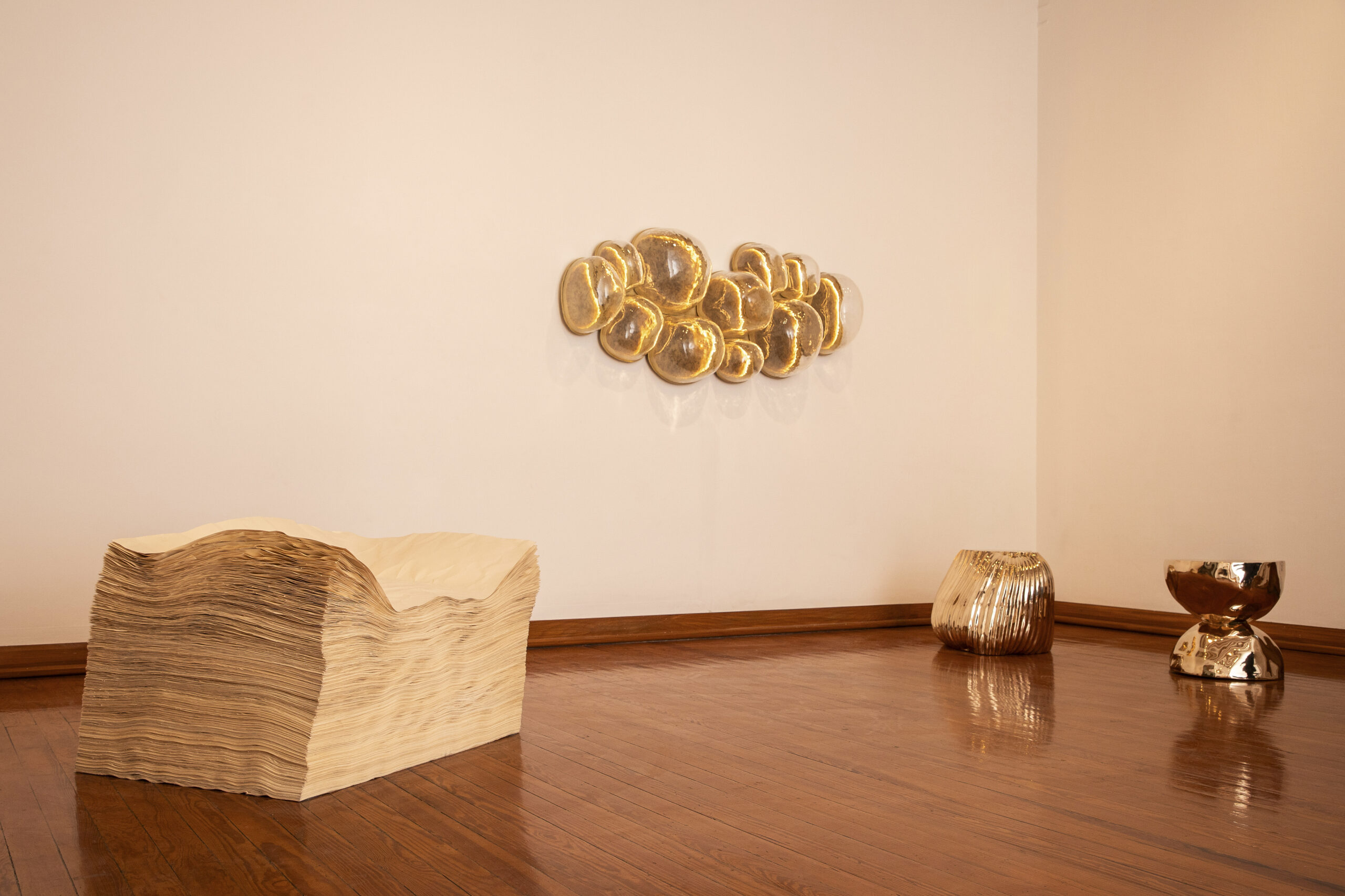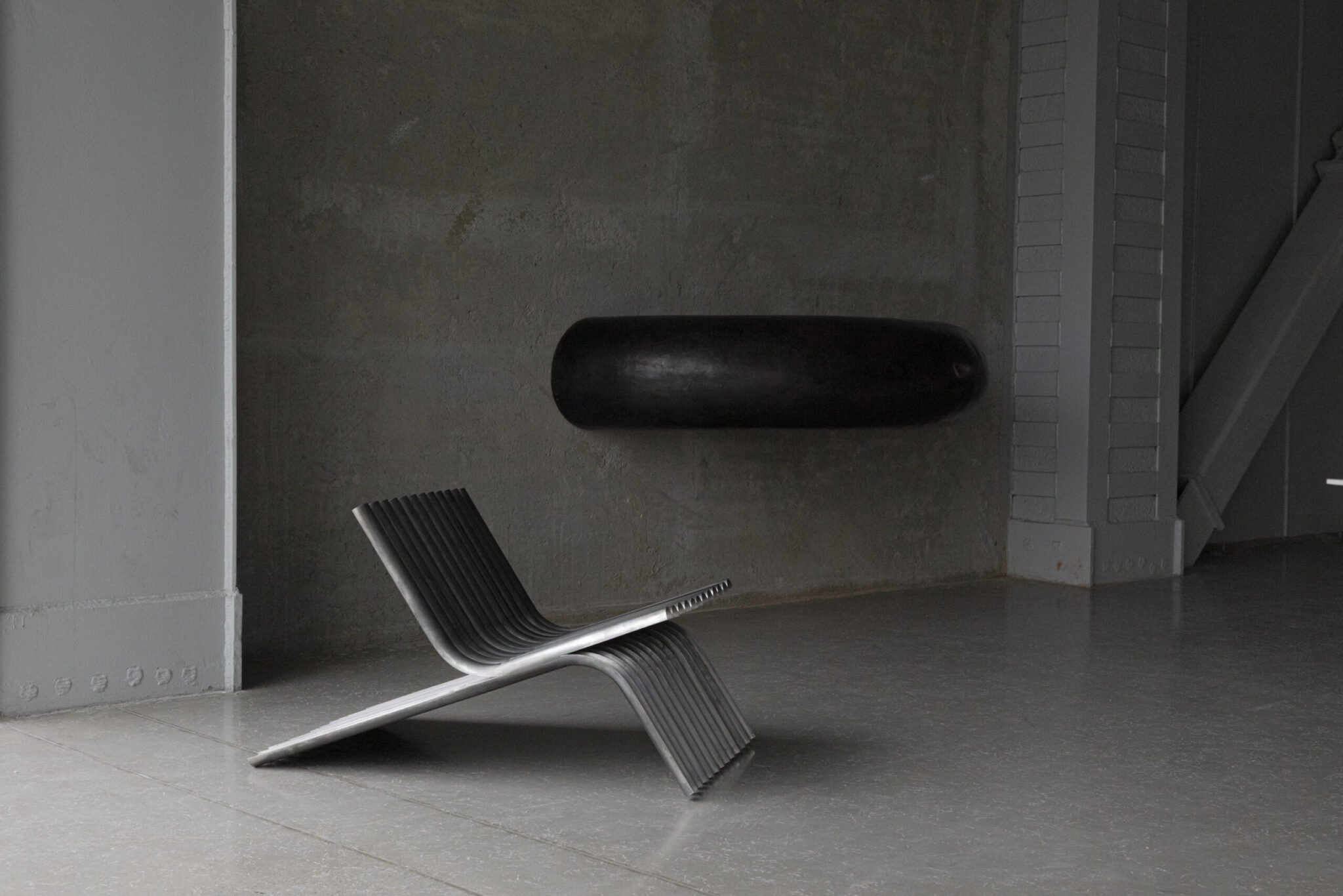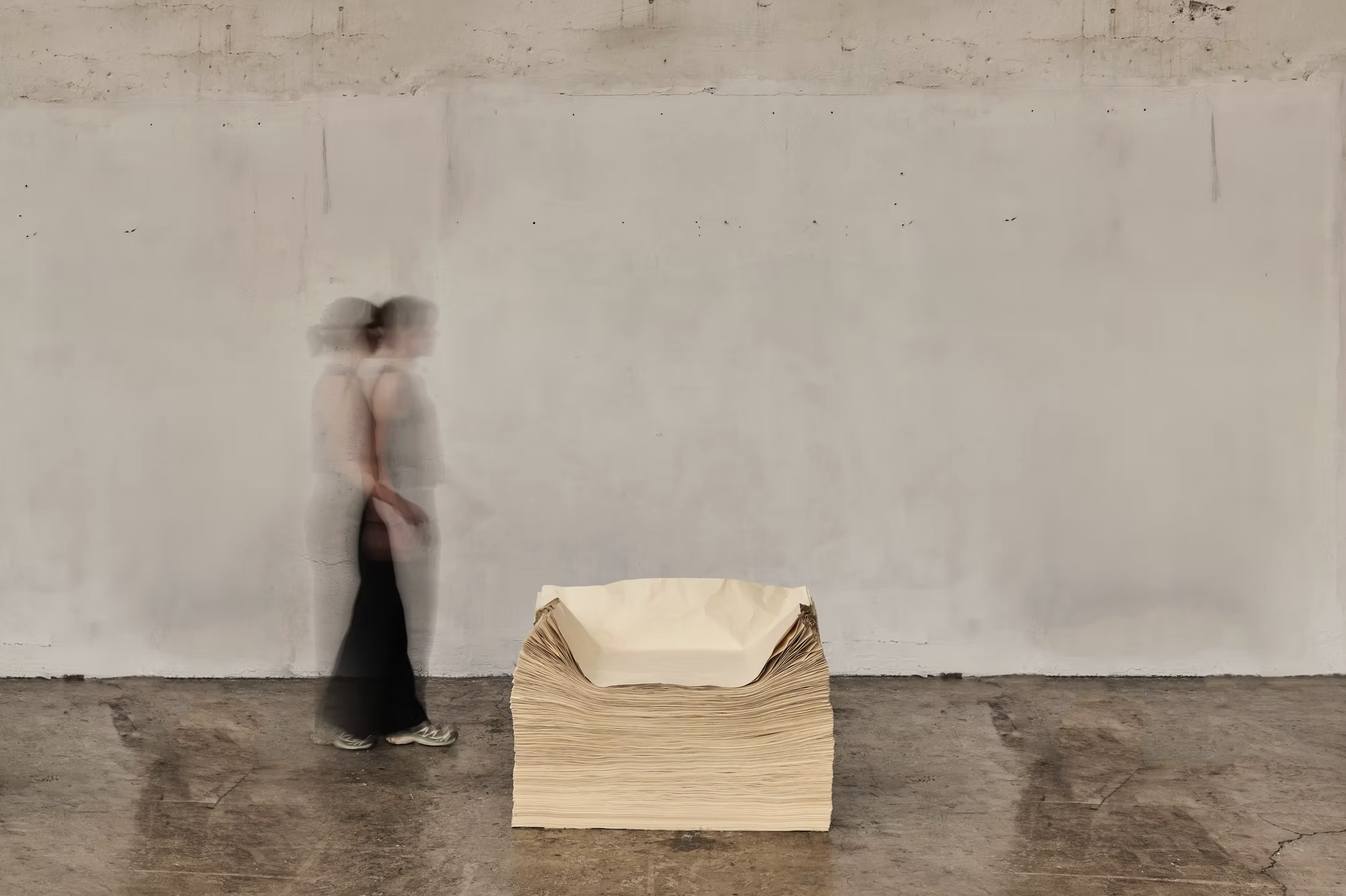 Born in California in 1979, Brian Thoreen is both artist and designer, currently working between Mexico City and Paris. Raised around construction, metal fabrication, and art installation, he developed an early and direct understanding of how materials behave in space. His practice is characterized by an extensive exploration of materials, including rubber, wax, paper, silicone, glass, and metals such as hammered copper, brass, and bronze. Heavy industrial materials are transformed into forms that appear soft, folded, or compressed, often using unexpected materials that provoke curiosity in the audience. Examples include his chairs crafted from Manila paper and his “sofa” constructed from red neoprene rubber. Thoreen’s designs deliberately blur the boundary between functional furniture and nonfunctional sculpture.