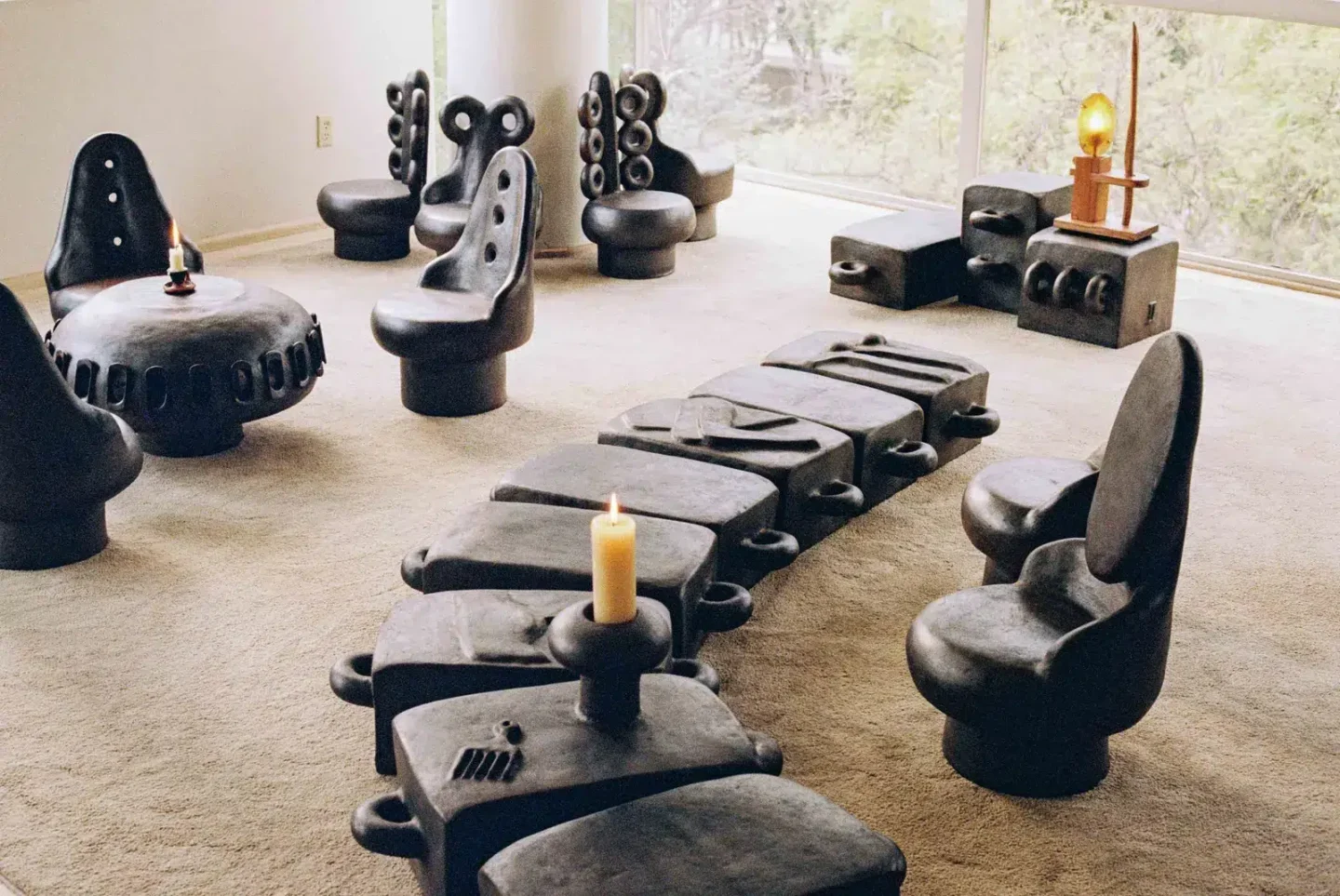 Originally from Barcelona, Pol Agustí is a designer based in Mexico City whose practice centres on black ceramic furniture and objects produced in the Mexican countryside. He is represented by Ago Projects. Twelve years ago, Agustí moved to Mexico after working across diverse fields including industrial design, art direction, production design, and photography, a multidisciplinary background that continues to inform his design approach. Working closely with local artisans, Agustí develops each collection through extended periods of shared living and making, using only three tools throughout the entire production process. This highly constrained methodology results in tables, chairs, lamps, and sound objects that have similar voluptuous forms and smooth cold surface texture. The pieces are characterised by black finishes and monolithic shapes that recall incinerated totems. As Agustí has remarked about his designs: “They’re like an excavation on Mars.”