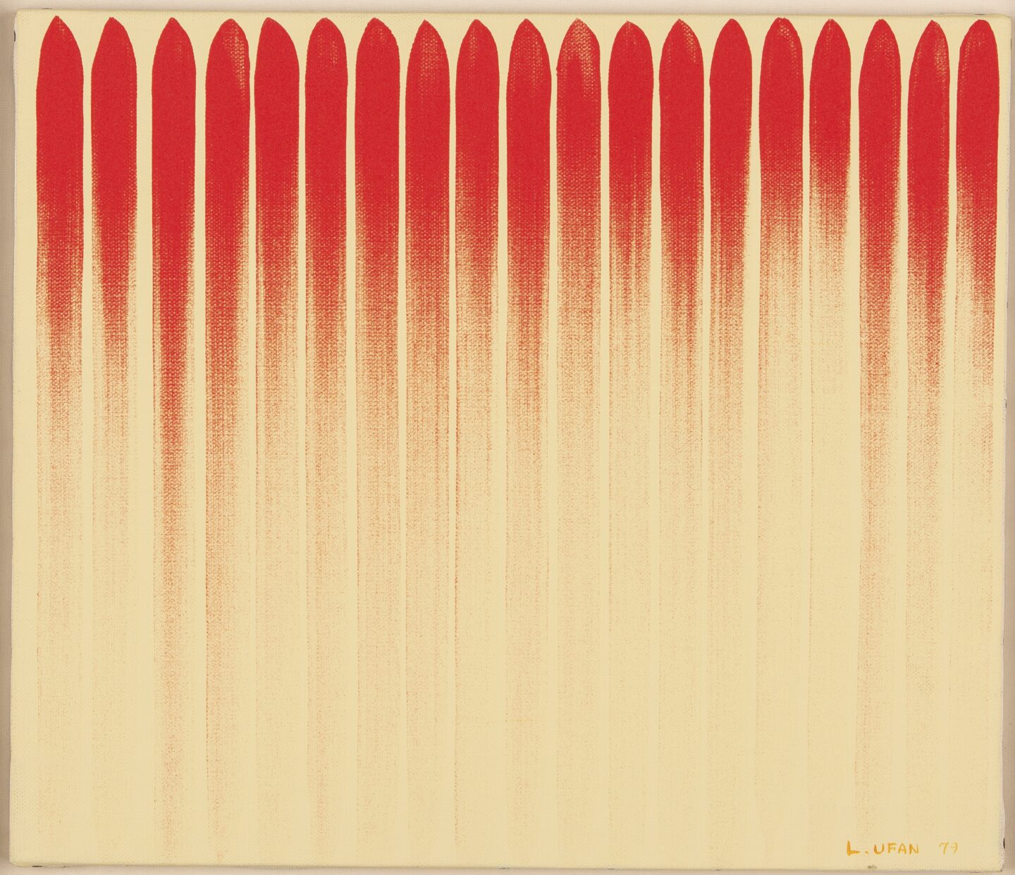 A crucial figure for Japanese and South Korean art scene, Lee Ufan is a pioneer of the former’s Mono Ha and of the latter’s Dansaekhwa. The work From Line no. 800128, greatly summarize the artist’s strengths: an elegant austerity obtained through dedication and meticulous labor. The painting process behind the work, in fact, is visible, with the pigment being denser on a side and fainter on the other. The canvases of the From Line series needs the viewer’s gaze to complete them: the brushstrokes’ movements described by the fading lines on the canvas are, in fact, activated through the act of looking.