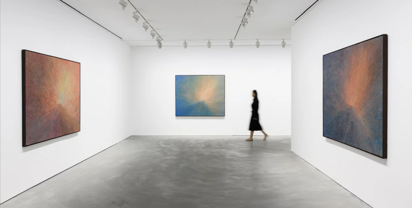 Standing at the intersection of human experience and the natural world he uses various highly pigmented oil sticks on wood to create layered, gestural marks, imbuing each semi-abstract rendering of a volcano with different moods and resonances. Using abstraction as a means of engaging with meditative, spiritual and philosophical understandings of nature, his work showcases an ineffable, nostalgic quality that defies any fixed narrative.