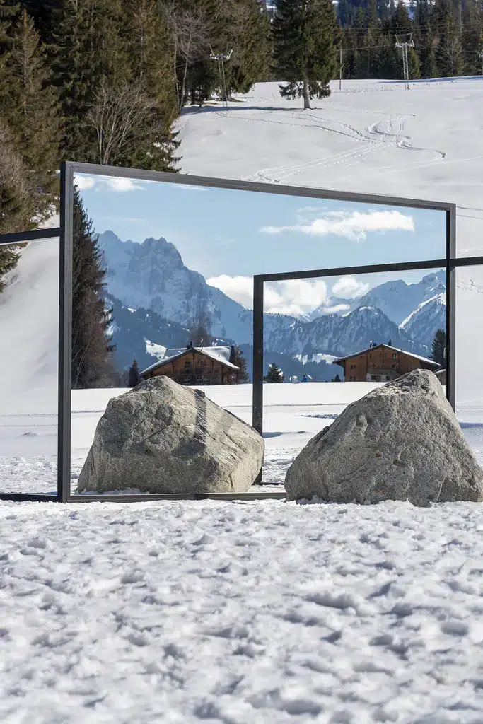 In Kwade’s Be-Hide series, she places two-sided mirrors between stones, multiplying the stones through reflection, and destabilising the viewer’s sense of what is real. At certain angles, the mirror may reflect the environment, expanding the viewer’s surroundings; other times, the stones appear fragmented or doubled, or at certain angles even look as though the stones are merging in real time. The work cannot be fully understood from a single viewpoint, and the Kwade’s work encourages the viewer to move around it, constantly shifting their position to change the entire nature of the work. As the viewer moves around the sculpture, the mirror continually shifts between acting as a reflective surface and a transparent window, causing the original stone and its replica to appear as interchangeable reflections. This creates a “game of hide-and-seek.” The title “Be-Hide” itself gestures toward Kwade’s conceptual intentions: the stone exists in real space (“be”), yet the mirror complicates this existence by making parts invisible (“hide”). In this series, the mirror becomes a tool for transforming stable real-world objects into unstable conceptual tools. She has done multiple iterations of this series, some more monumental, titled “Big Be-Hide” and some more intimate in scale, titled “Little Be-Hide.” She has also created a few versions where she incorporated additional stones and mirrors, creating more complex installations that also introduce questions around parallel realities.