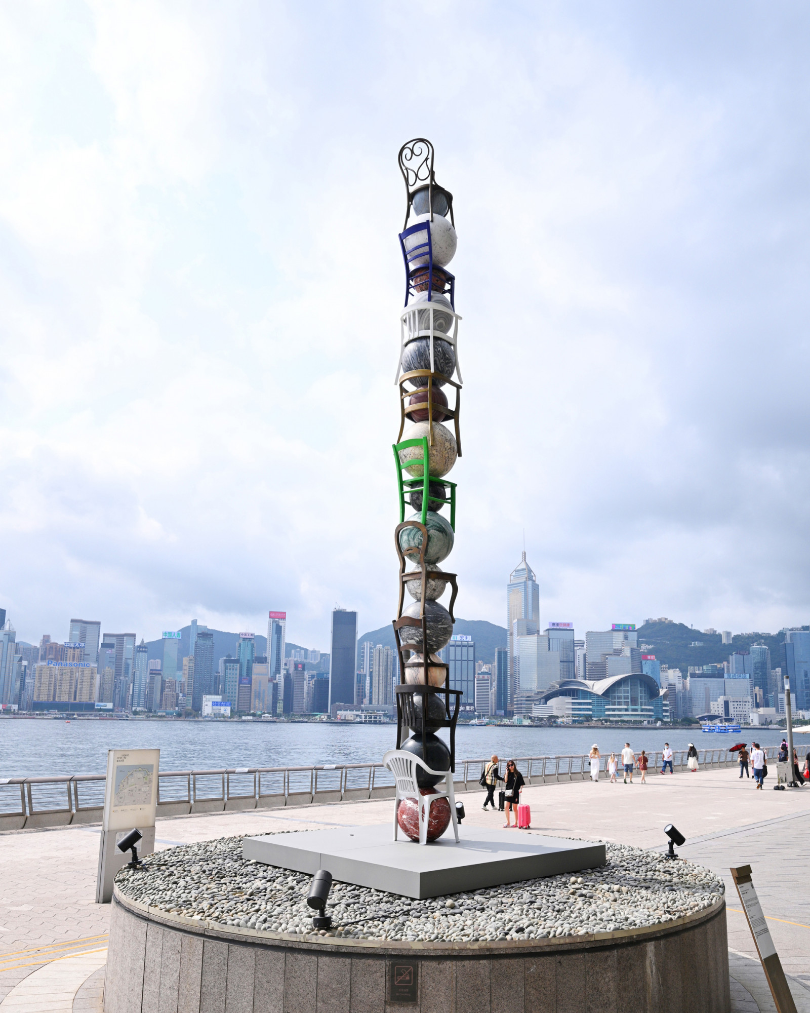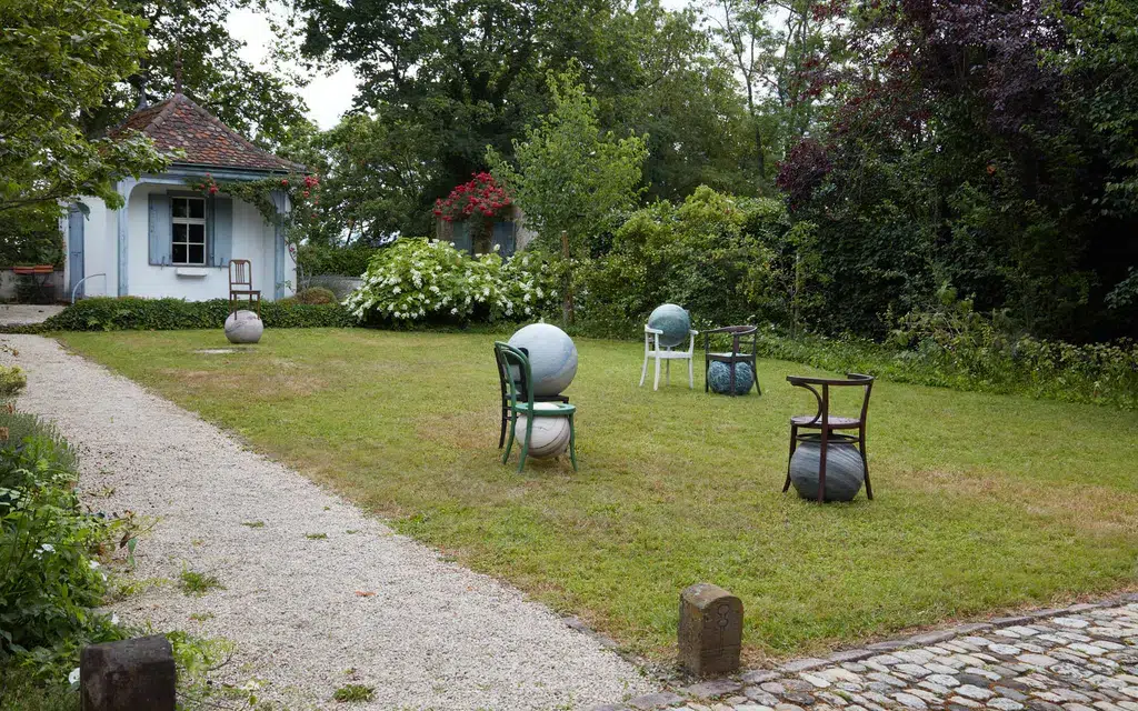 The title L’ordre des mondes references Piero Manzoni’s 1961 bronze Socle du Monde, whose inscription can only be read upside down, causing the pedestal to appear inverted and serve as the foundation of the world. Drawing on this conceptual idea, Kwade’s series engages with profound themes in a likewise playful manner, suggesting with a touch of humour that we all fantasize about sitting on the globe and contemplating the universe. The series includes multiple iterations: sometimes a sphere sits beneath a chair, sometimes the chair balances atop it, and sometimes multiple chairs and spheres are combined.