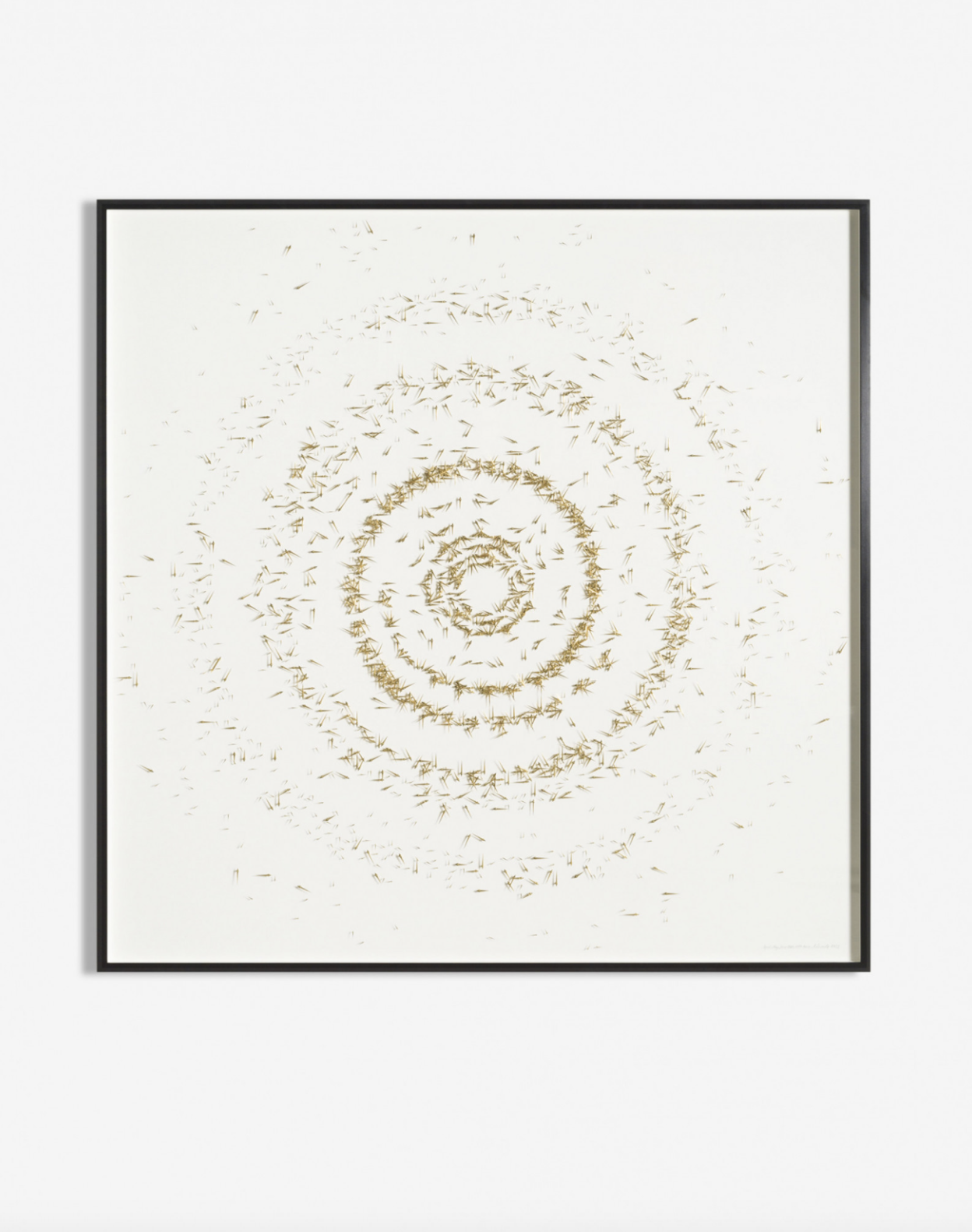 In her series Entropie, Kwade arranges immobile watch hands on paper, often plated to appear gold against a white background. The metallic plating not only creates a striking visual effect but also adds a symbolic layer, referencing the idea of time being valuable. Each work corresponds to a specific span of time measured in days or hours, with the number of hands increasing in proportion to the duration represented. Kwade developed the series during lockdown, treating it as a diary of sorts. As she explained in an interview, “I tried to create one piece every day and record the passing of time as it appeared to me, because these lockdowns have changed my perception of time extremely. All travelling suddenly stopped, projects were frozen in process, everything became very slow and at the same time extremely fast; a standstill race.” During lockdown, she studied the system of time itself, asking questions such as “why are there twelve numbers?” and “why are there numbers at all?” She searched for patterns in her research and tried to connect her results to light. She saw that when the clock’s numbers are reinterpreted in a linear arrangement, the watch hands form patterns reminiscent of light or sine waves. The concept of entropy, a scientific measure of a system’s disorder or randomness, underpins the work. Although the arrangement of the clock hands may initially appear structured or rhythmic, there is an underlying sense of disorder. The clocks are motionless and functionally meaningless as timekeeping devices. Kwade’s work invites reflection on the human impulse to measure and order time, while reminding us that these systems are ultimately constructs.