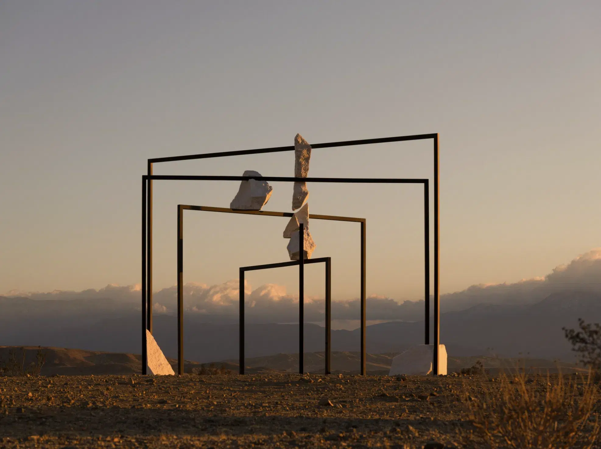Kwade created another iteration for this series, ParaPivot (sempiternal clouds) for Desert X in 2021. Here, instead of smooth stone spheres, massive blocks of white marble appear like fragments of glacier ice transported from another world. As viewers move through and around its frames, the sculpture seems to shift in response, echoing an experiential version of Heisenberg’s uncertainty principle. The act of observing subtly alters what is being observed, creating an illusion of perpetual instability. The steel appendages radiating from the structure’s central points seem to trace an invisible orbital path, recalling the early scientific instrument used by Greek and later Islamic astronomers to map the positions of stars and planets. It evokes humanity’s ongoing attempt to chart the universe and to understand our shifting place within it.