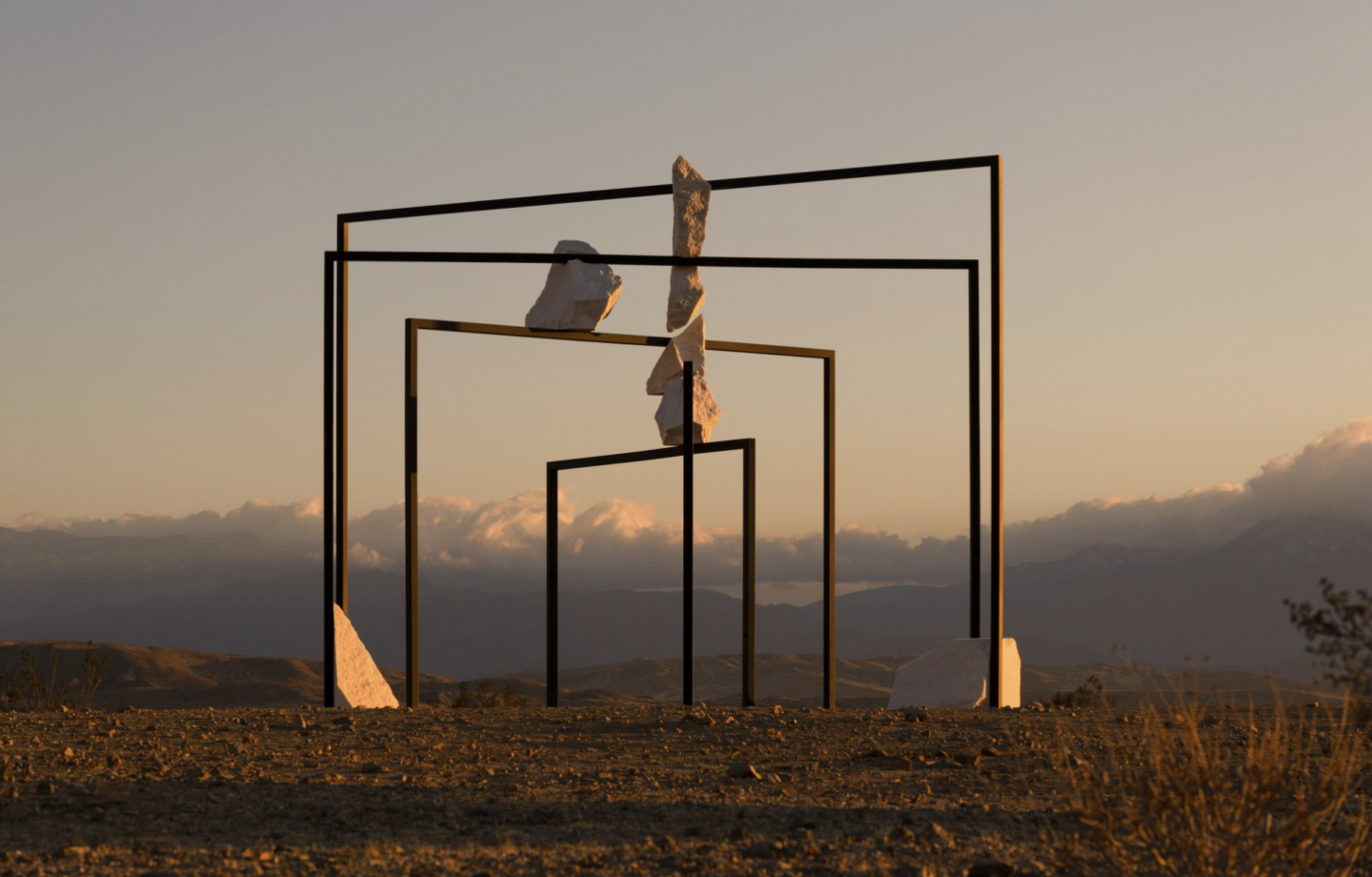Kwade created another iteration for this series, ParaPivot (sempiternal clouds) for Desert X in 2021. Here, instead of smooth stone spheres, massive blocks of white marble appear like fragments of glacier ice transported from another world. As viewers move through and around its frames, the sculpture seems to shift in response, echoing an experiential version of Heisenberg’s uncertainty principle. The act of observing subtly alters what is being observed, creating an illusion of perpetual instability. The steel appendages radiating from the structure’s central points seem to trace an invisible orbital path, recalling the early scientific instrument used by Greek and later Islamic astronomers to map the positions of stars and planets. It evokes humanity’s ongoing attempt to chart the universe and to understand our shifting place within it.