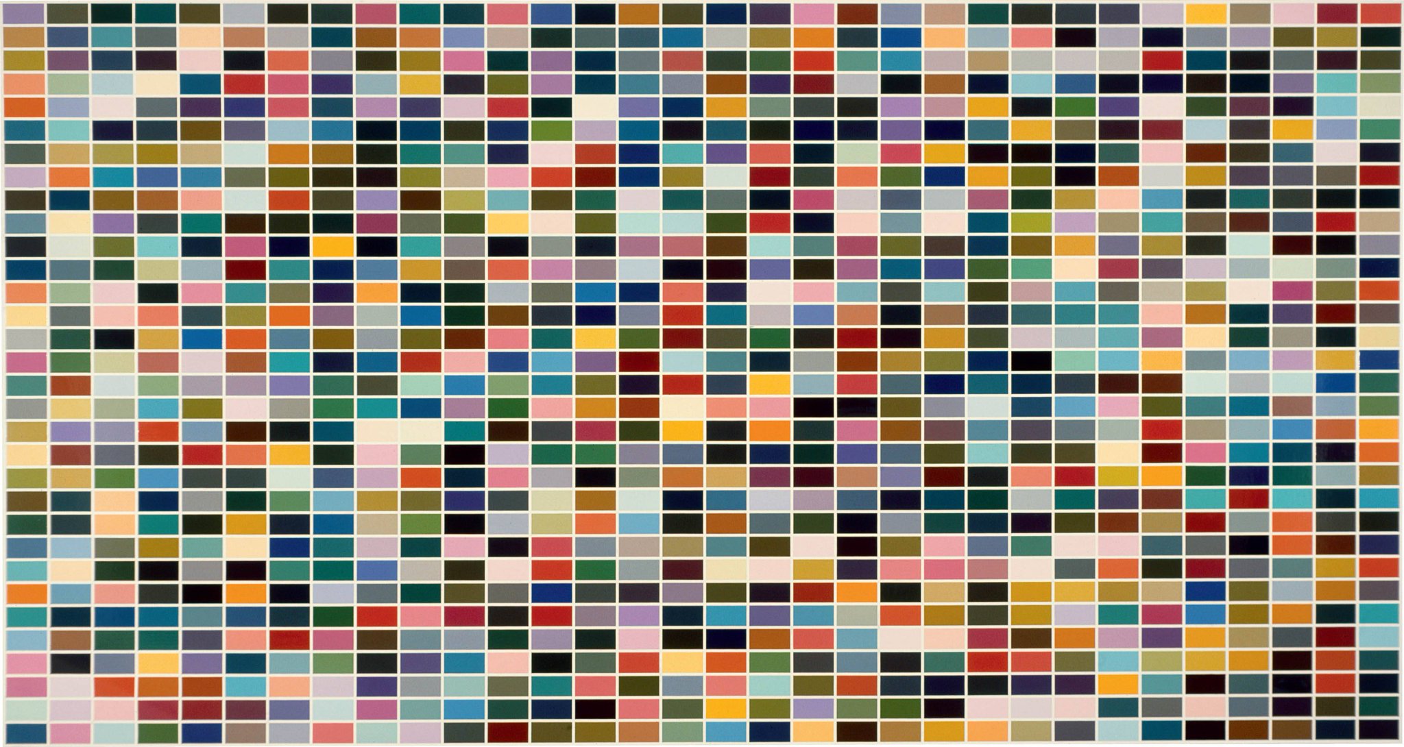 Richter conceived a series of works called the Color Chart paintings after a visit to a Düsseldorf hardware store, where the artist noticed an array of paint sample cards. He became inspired by the industrially formulated and chromatically comprehensive selection that was utterly devoid of aesthetic motive. In order to make the paintings, he copied the cards exactly, injecting as little compositional input as he could. Each Color Chart painting presents multiple uniquely colored and uniformly sized rectangles or squares of glossy paint arranged on a white background. The Color Charts were among the first of Richter’s paintings not done in black and white, and stands as a memorable example of Richter’s ability to constantly reinvent his artistic practice.