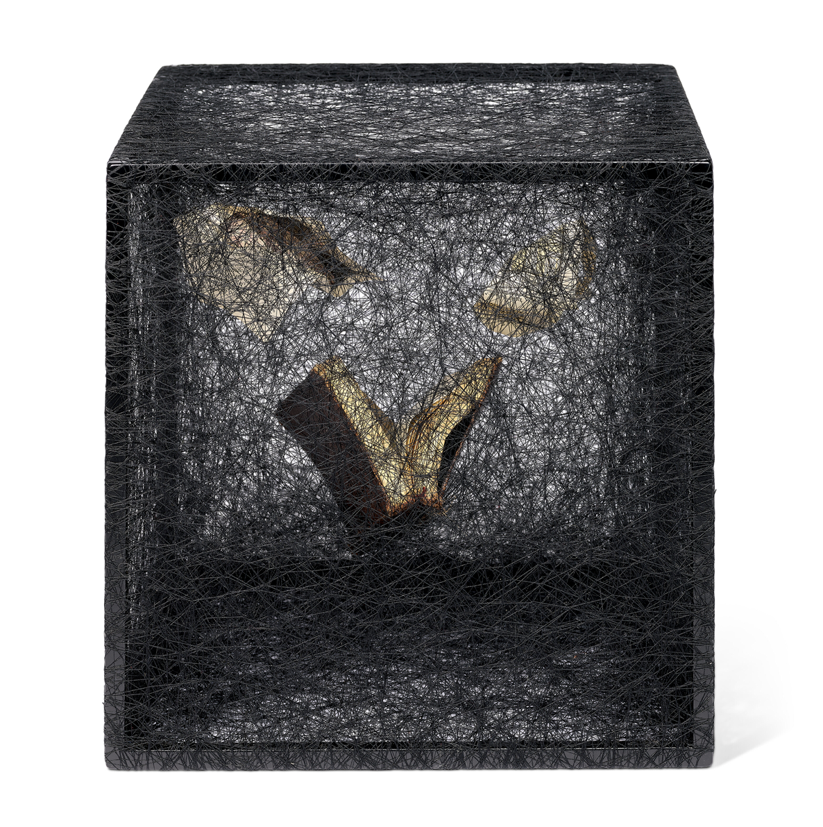 Alongside these monumental installations, Shiota maintains a sustained practice in smaller-scale works, including intimate thread sculptures, framed compositions, works on paper, and delicate drawings. In these pieces, thread is often contained within wooden frames or glass vitrines, where it forms compact, tangled constellations around single objects such as letters, shoes, or fragments of fabric. She also produces watercolours and sketch-like drawings that map the conceptual foundations of her installations, revealing her sensitivity to line, gesture, and spatial rhythm. These quieter works condense the emotional intensity of her environments into concentrated forms, demonstrating that her exploration of memory and connection does not depend on scale alone.