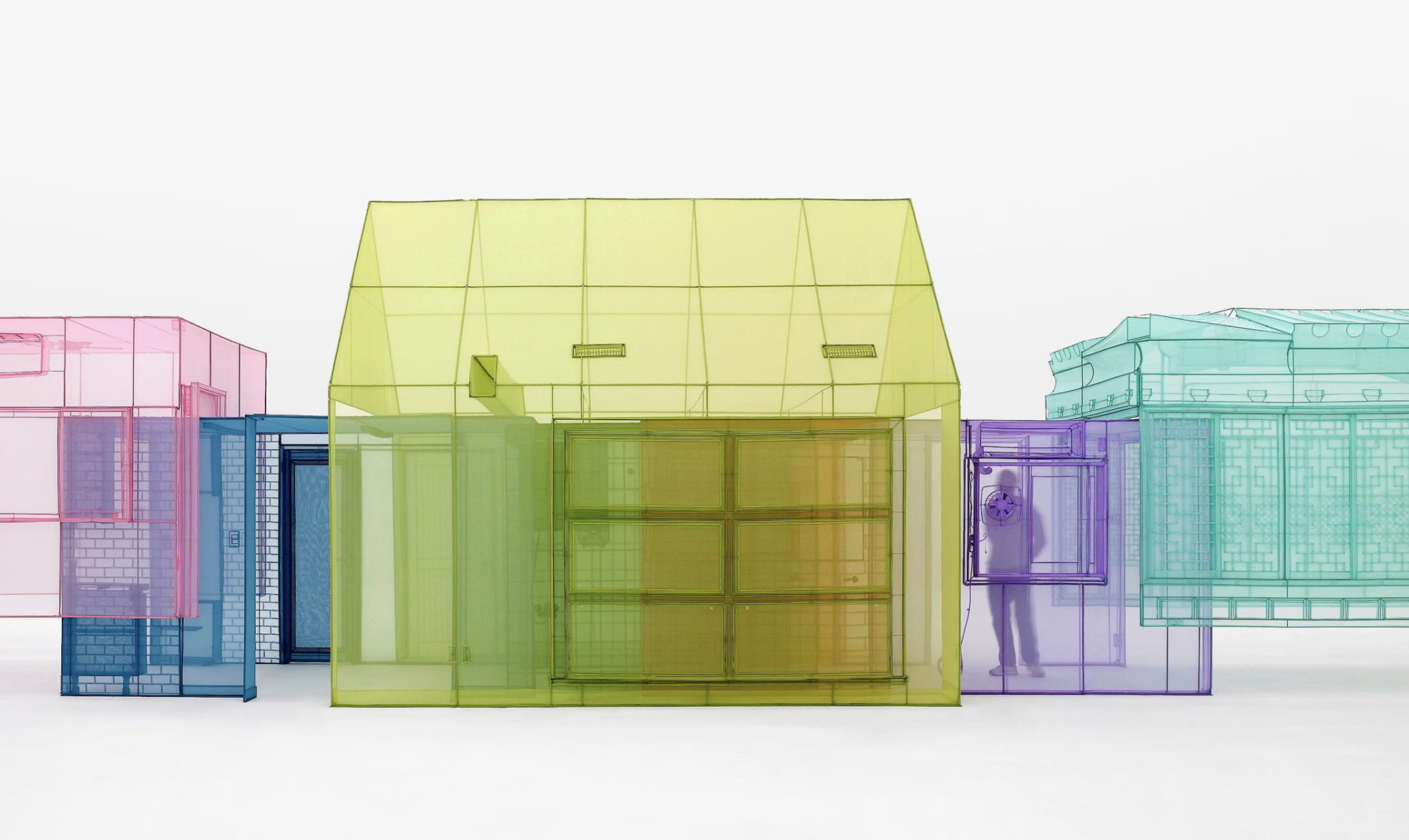 Do Ho Suh (b. 1962) was born in Seoul, South Korea, and is based between London and Seoul. His practice centres on architecture, memory, and the experience of displacement. Working primarily with translucent polyester fabric, he creates full-scale replicas of domestic interiors, corridors, staircases, and architectural thresholds drawn from places he has lived. Meticulously measured and reconstructed in sewn fabric, often in vivid monochromatic hues, these structures include electrical fixtures, door handles, light switches, and even the smallest architectural details rendered in textile. Lightweight and portable, they reproduce spaces that once signified permanence and belonging, creating a tension between fragility and structure that lies at the core of his work.