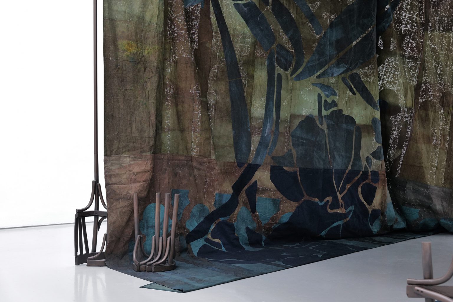 The fabrics that make up her work are repeatedly soaked, folded, stained, and layered with pigment over time. She then employs a process of décollage, cutting and removing parts of the fabric, which she describes as “a radical and poetic strategy that is as much destructive as it is constructive; where the act of undoing and unbuilding becomes an addition rather than a negation to the work.” These fragments are then reassembled into sculptural tapestries that often hang freely in space, their raw edges and visible seams emphasizing their materiality. Gravity shapes the final form, and light passing through thinner sections reveals subtle variations in tone, lending the works both weight and permeability.