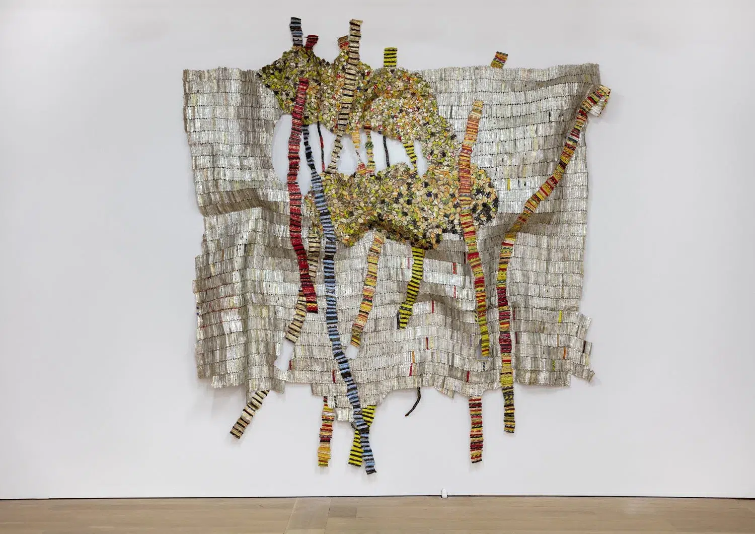 While it might appear that he is simply recycling materials, Anatsui frames his practice differently, describing it as a “transformation” of the objects he uses. The bottle caps, for example, carry both personal and historical resonance: “To me, the bottle tops encapsulate the essence of the alcoholic drinks which were brought to Africa by Europeans as trade items at the time of the earliest contact between the two peoples.” By using materials associated with consumption and trade, he reflects on histories of colonial exchange, global commerce, and the movement of goods and people. In his hands, these discarded items become luminous, abstract fields of color and texture. His work shows that textile-inspired techniques do not have to be soft or delicate; he takes the tradition of stitching and modernizes it with unconventional materials, effectively revolutionizing what might be called “textile art.”