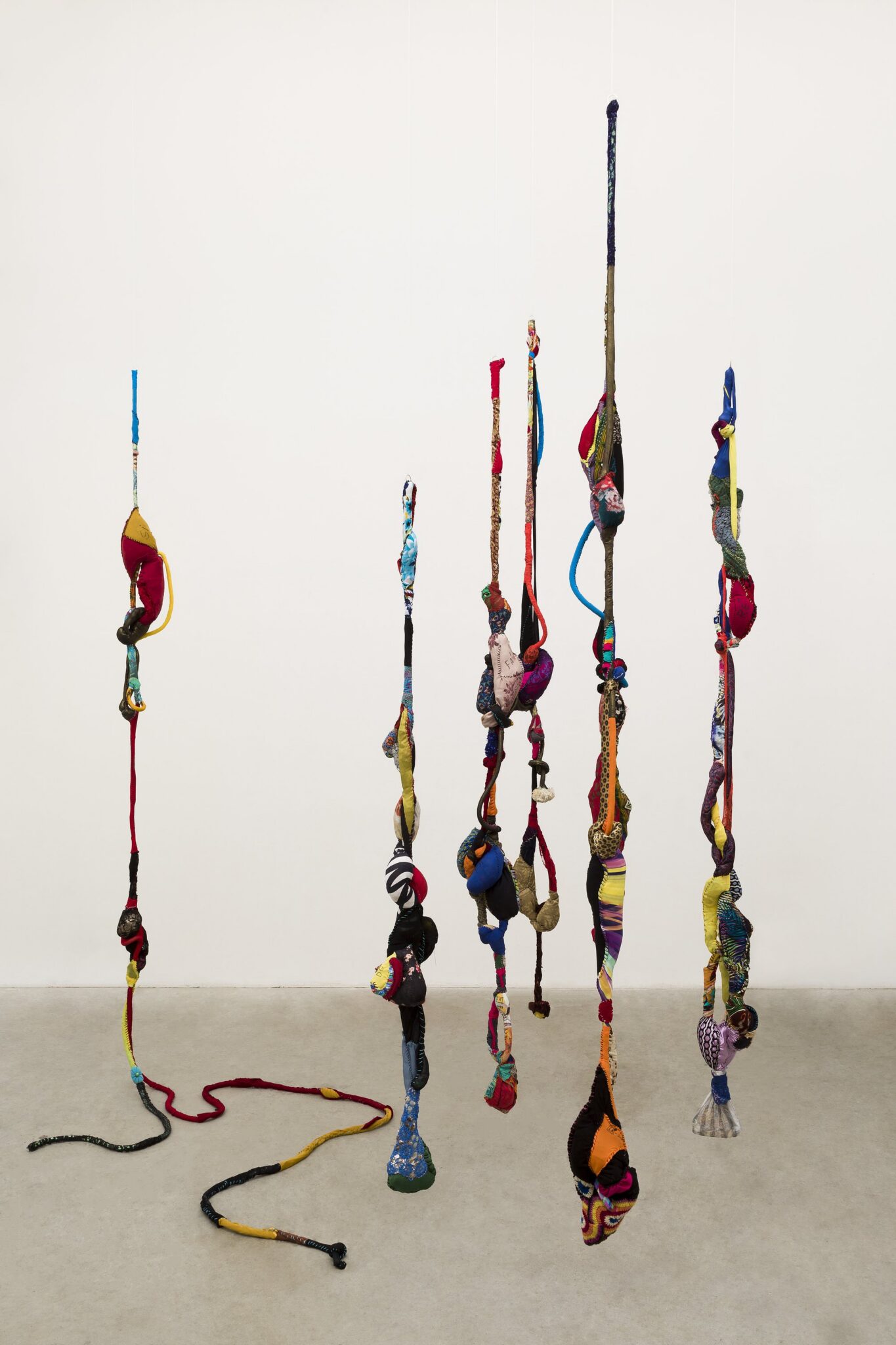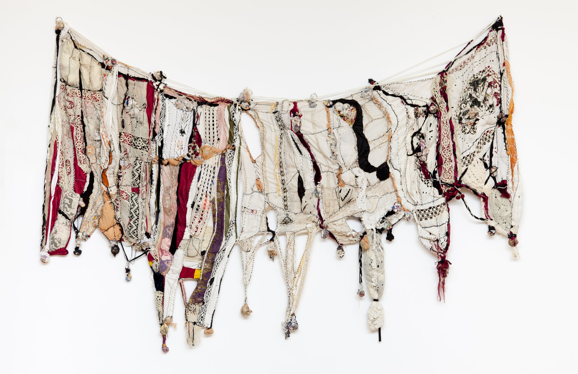 Sonia Gomes (b. 1948) is a Brazilian contemporary artist known for her sculptural works made from reclaimed fabrics, ropes, and textiles. She collects used materials such as clothing, lace, embroidery, and other domestic fabrics, transforming them into complex three-dimensional forms. By knotting, twisting, and wrapping the materials together, she creates organic sculptures that appear to grow, hang, or stretch through space. Her process is intuitive and guided by the textures, colours, and histories of the fabrics themselves.